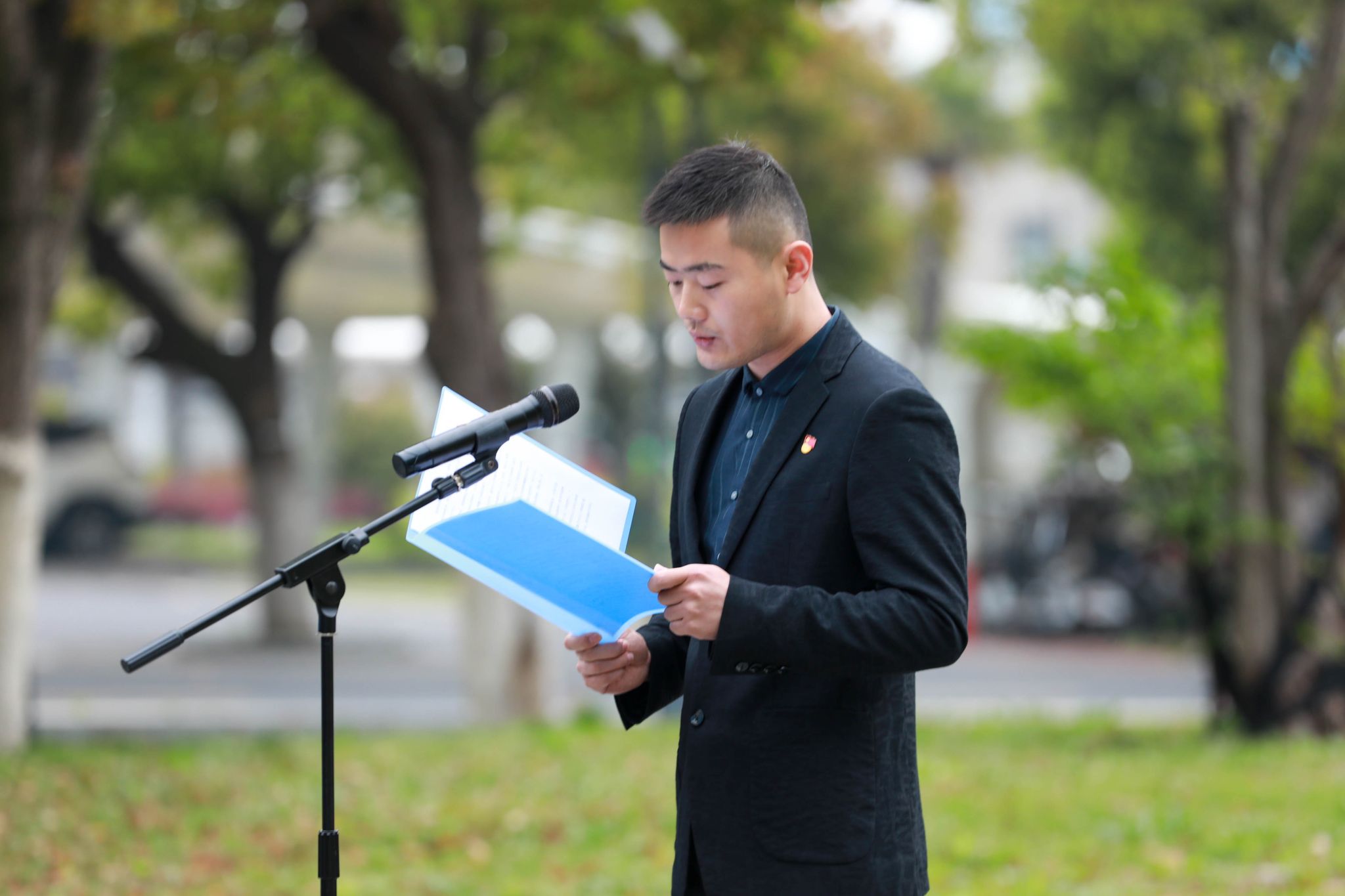 刘磊老师代表学院优秀教师发言,鼓励同学们敢于面对差距、正视问题,从现在开始努力,立志民族复兴,把青春播撒在江淮大地上,不负时代,不负韶华。