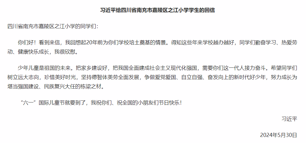 新华社北京5月31日电 在“六一”国际儿童节即将到来之际,中共中央总书记、国家主席、中央军委主席习近平5月30日给四川省南充市嘉陵区之江小学的学生们回信,对他们予以亲切勉励,并祝他们和全国的少年儿童节日快乐。