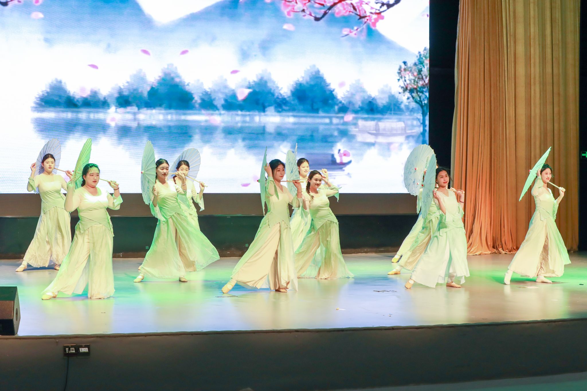 器乐演奏《流水》仿若一阵清风,为观众们带来别样的清幽古韵。清脆悦耳的音符,恰似清泉在石上缓缓流淌,舞台背景上,水墨山水画卷徐徐展开,与音乐相得益彰。舞蹈节目《清凤徐来》宛如微风拂面,舞者们身着淡雅服饰,身姿轻盈典雅,举手投足间尽显古韵遗风;《风声》则截然不同,舞者们以刚劲有力的动作,传递出坚韧不拔的精神力量;而《热情的沙漠》瞬间将气氛点燃至沸点,舞者们身着鲜艳火辣的服装,热情奔放地舞姿尽显青春活力。